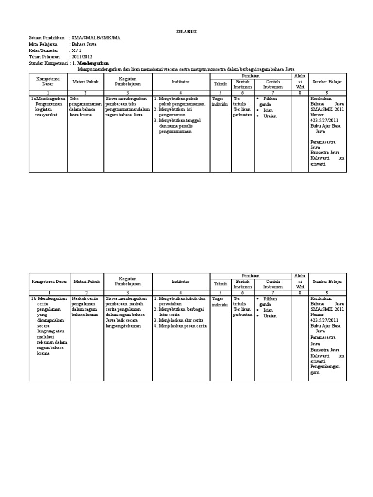 Rpp bahasa jawa kurikulum 2 kelas 4 semeser 1 Memahami informasi dari berbagai laporan 1.1. Silabus basa jawa kelas 2. Secara umum tema ini tentang keberagaman suku dan bahasa yang ada di indonesia. Mampu mendengarkan dan memahami ragam wacana lisan melalui mendengarkan pesan langsung, cerita wayang, drama dan ungkapan teman tentang kegemaran.